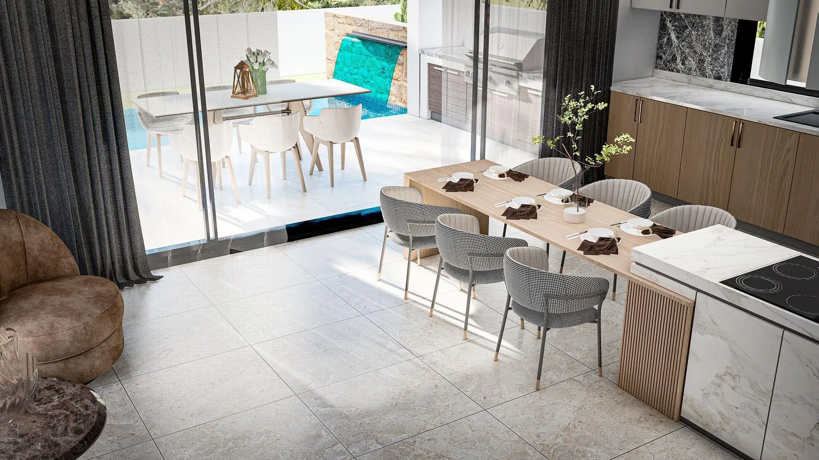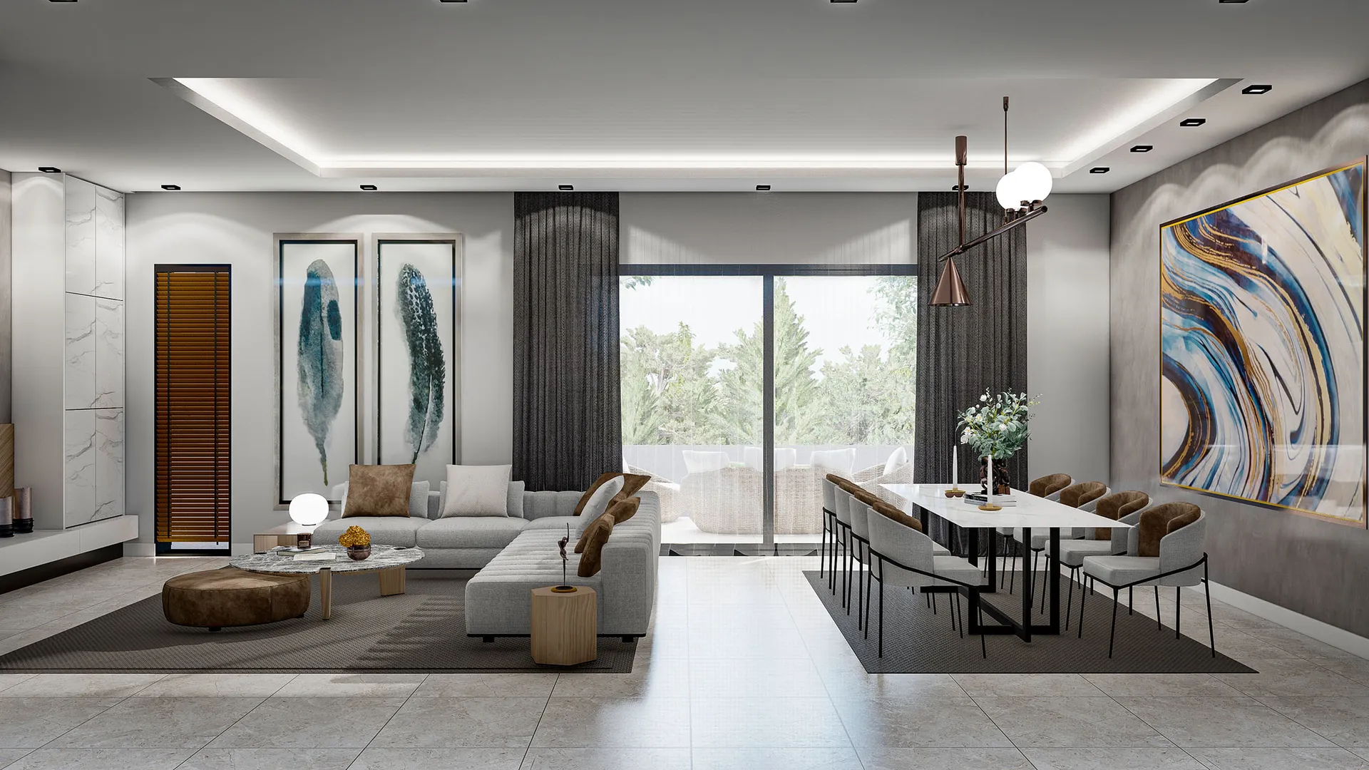 Majestic Villas’ta salonlar, ailenizin en çok vakit geçireceği alanlar düşünülerek geniş ve ferah tasarlandı. Büyük pencereler sayesinde doğal ışık maksimum seviyede içeri alınırken, açık plan mimari ferah bir yaşam alanı sunuyor.