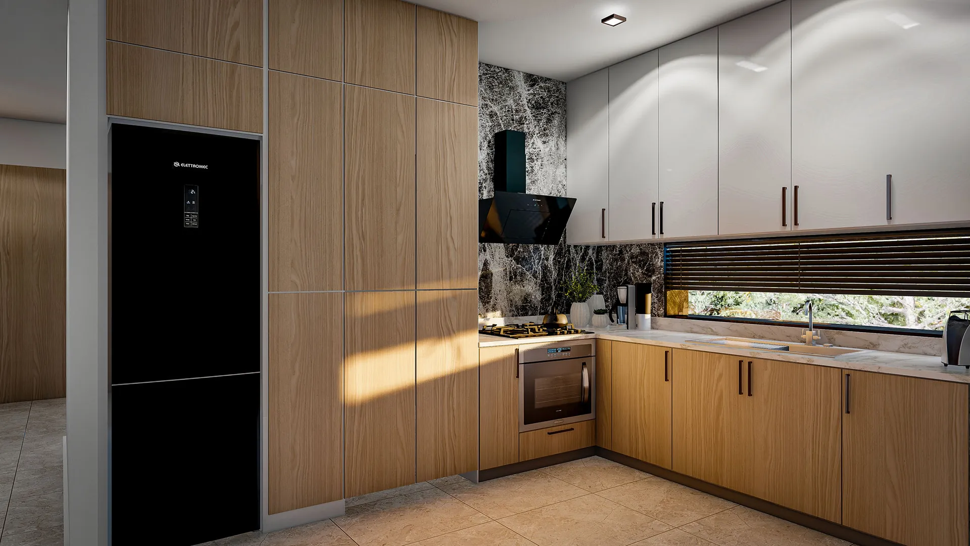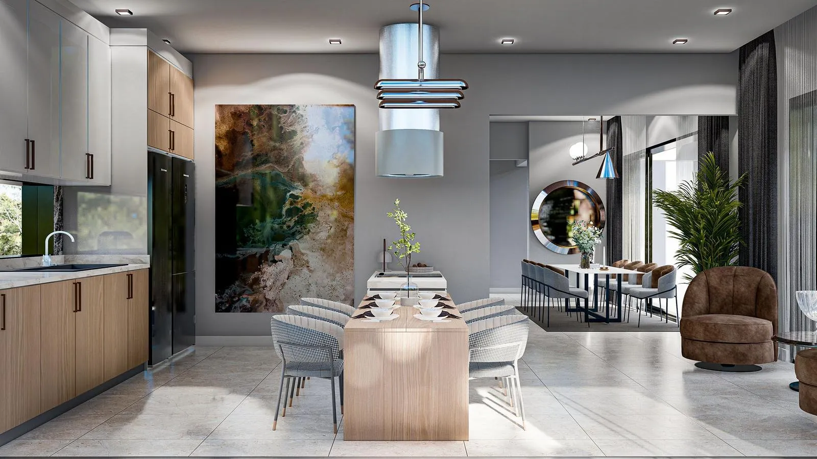 High Gloss mutfak dolapları, granit tezgâhlar ve geniş kiler alanları ile mutfağınız sadece bir yaşam alanı değil, aynı zamanda keyifli bir deneyim alanı. Fonksiyonel planlama sayesinde hem şık hem kullanışlı bir tasarım sunuluyor.